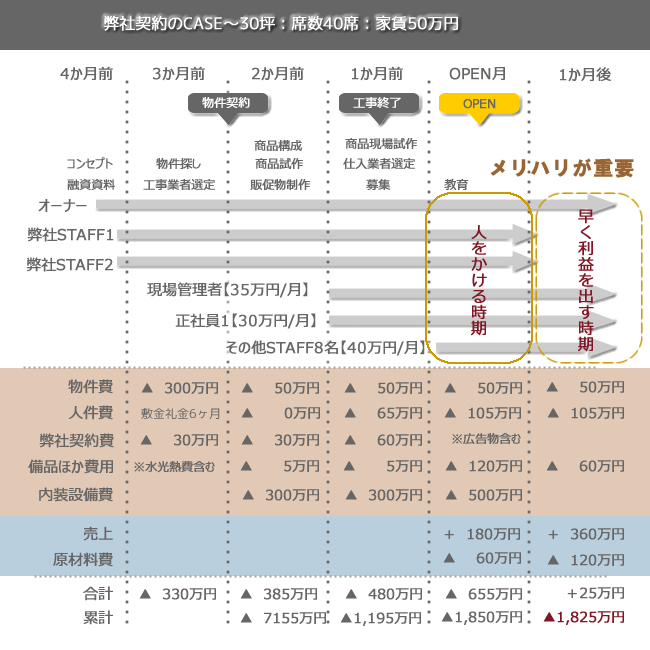 OPEN時には弊社STAFFが現場に入ってしっかり教育し、あとは必要最小限の社員で、利益を上げていくことができますので、弊社へのフィーが発生したとしても、数百万円の利益がもたらされるでしょう。